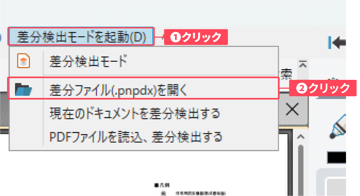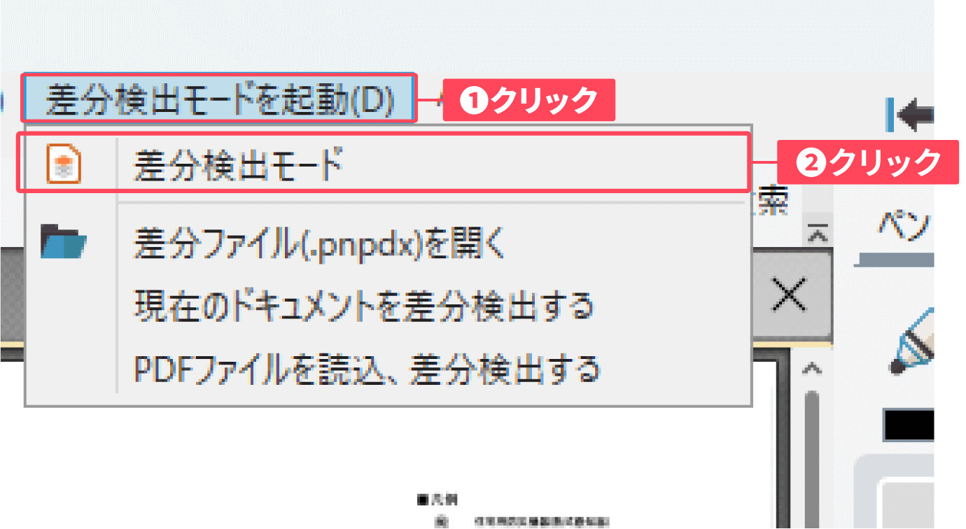 上部メニューの「差分検出モードの起動」から「差分検出モード」をクリックします。