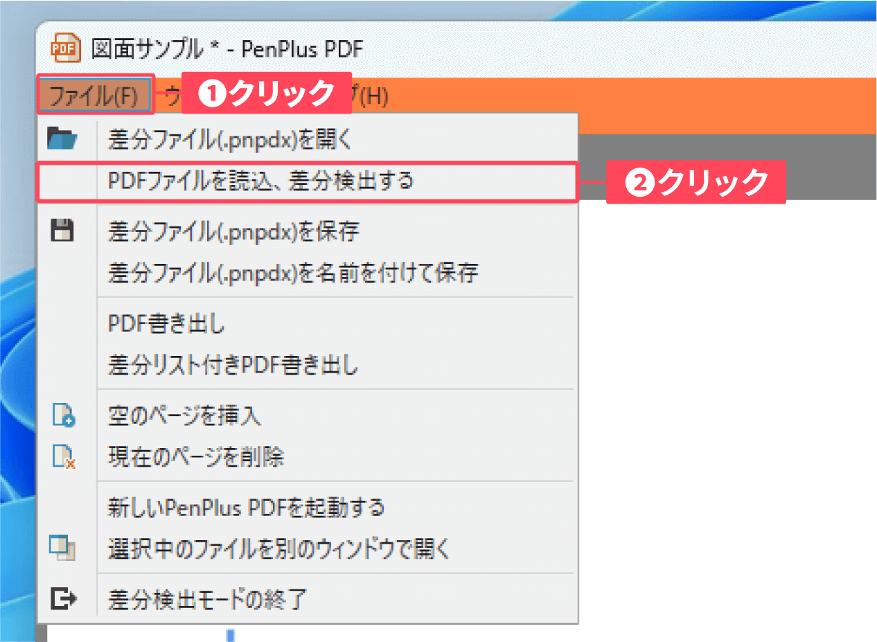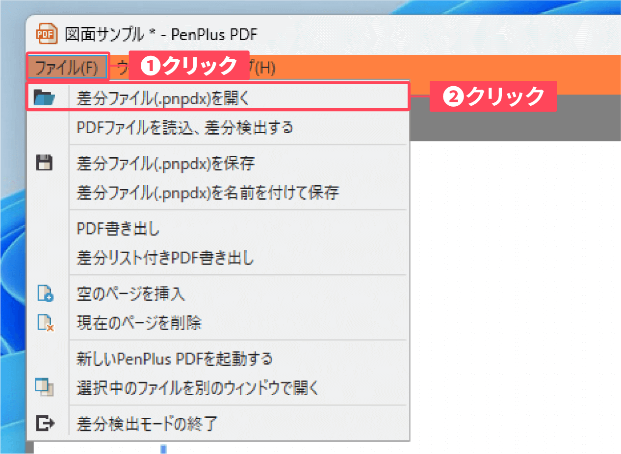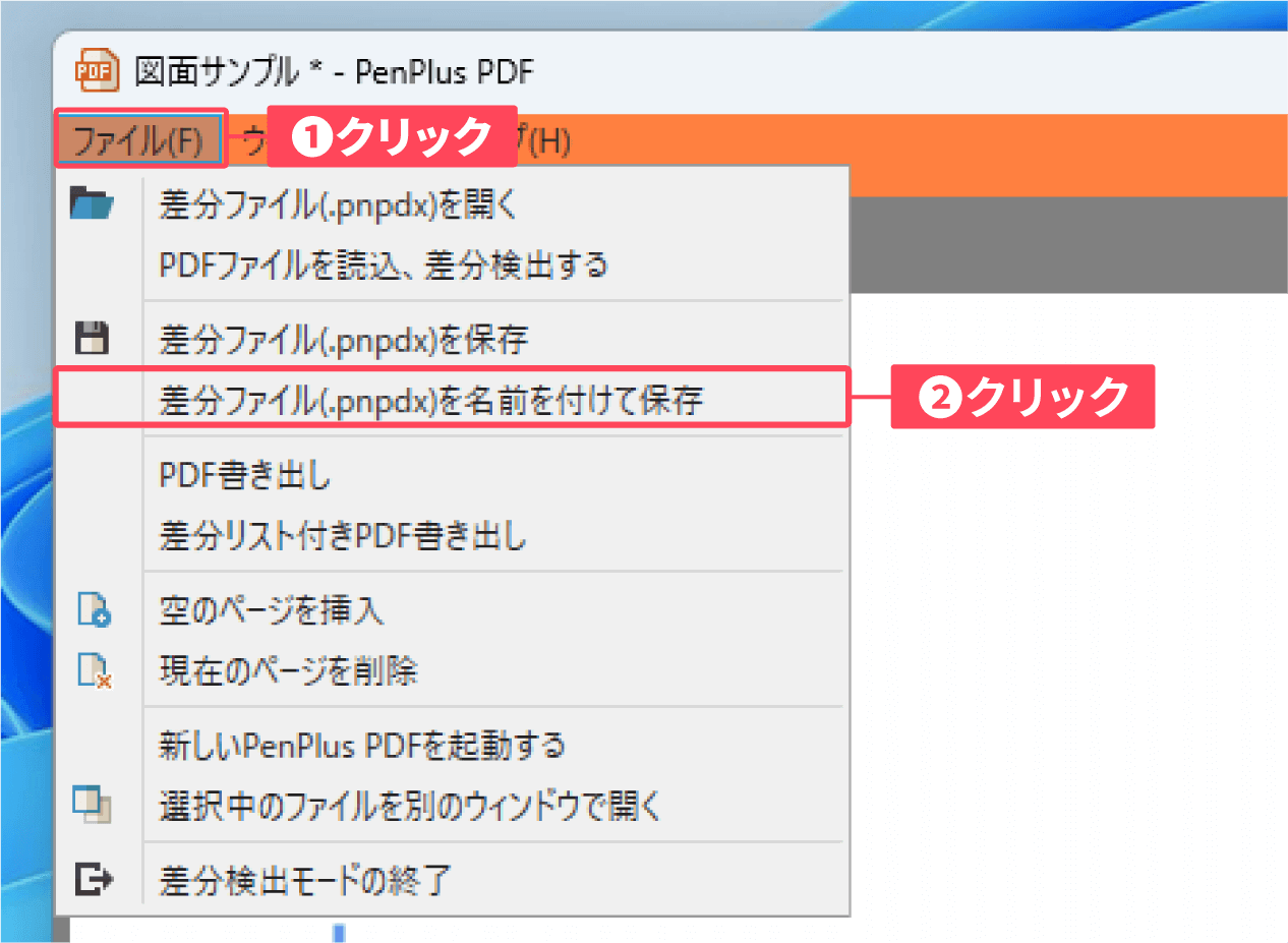①差分検出モード画面左上の「ファイル」 をクリックし、②表示されたメニューから「差分ファイル(.pnpdx)を名前を付けて保存」をクリックします。
