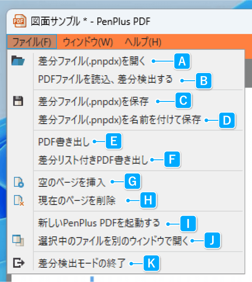 | A | 差分ファイル(.pnpdx)を開く | 既存の差分ファイルを選択し、差分検出モードへ読み込みます。 |
