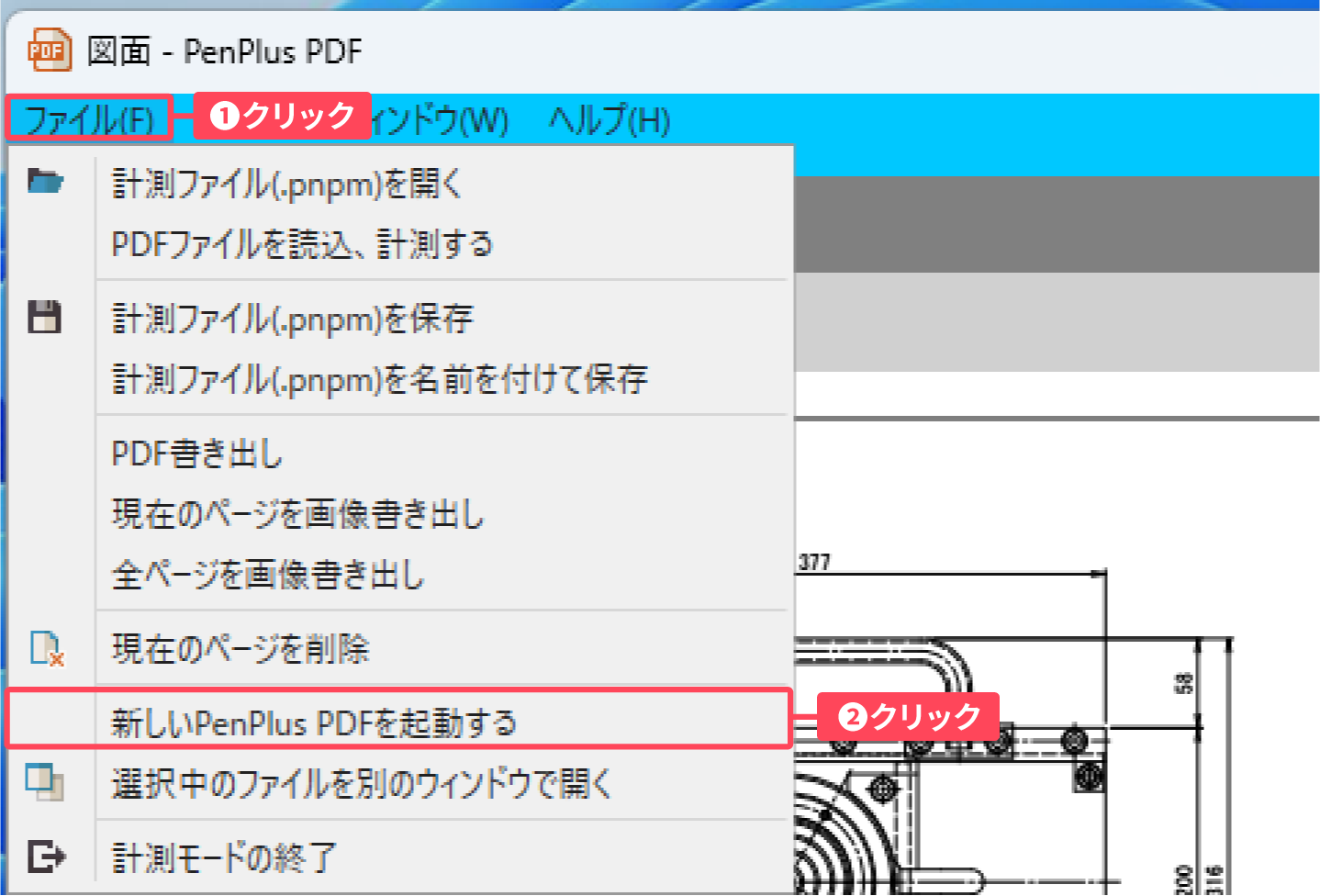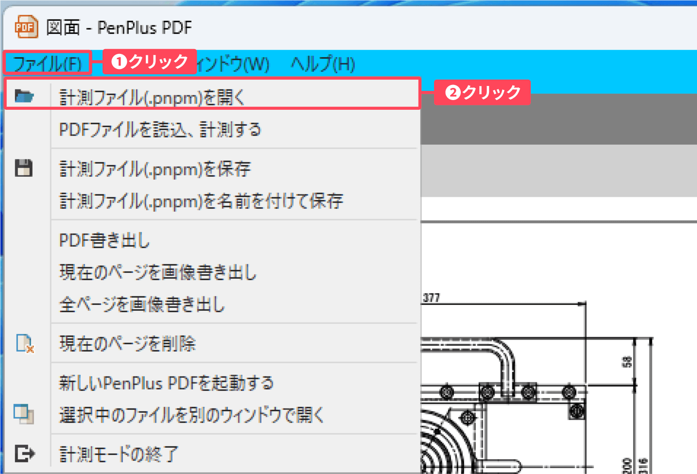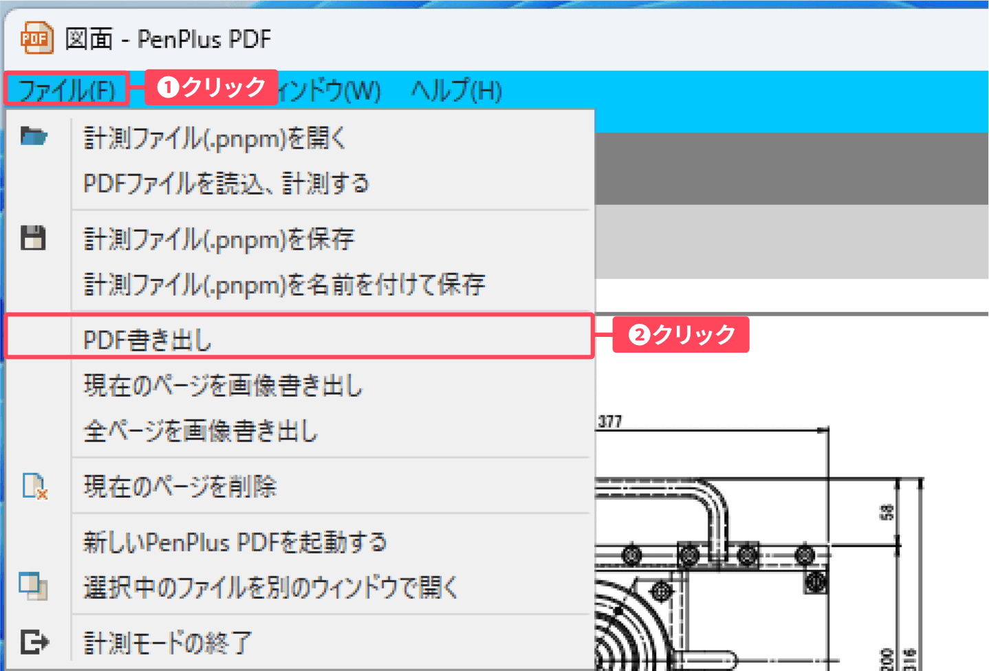 ①計測モード画面左上の「ファイル」 をクリックし、②表示されたメニューから「PDF書き出し」をクリックします。