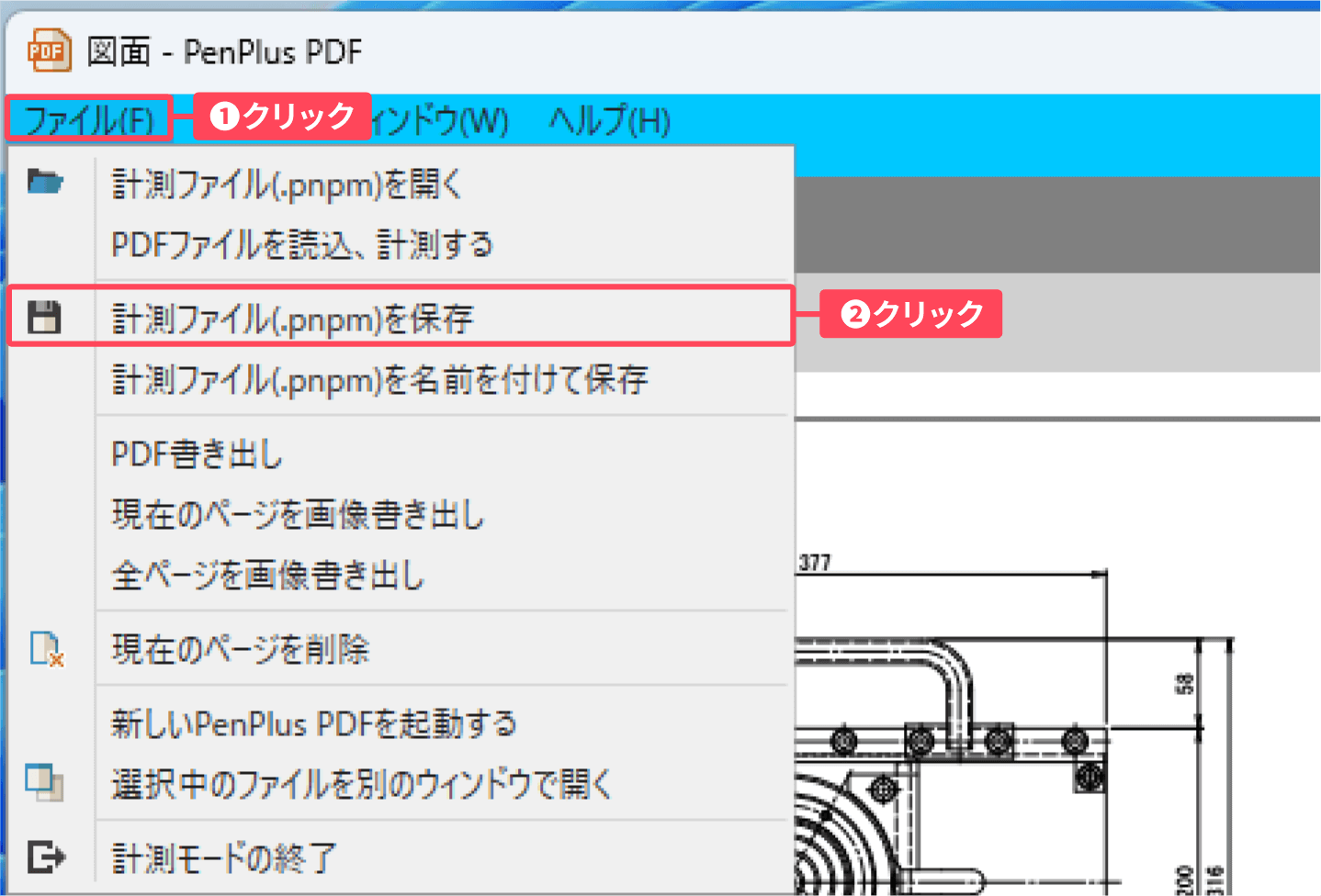 ①計測モード画面左上の「ファイル」 をクリックし、②表示されたメニューから「計測ファイル(.pnpm)を保存」をクリックします。