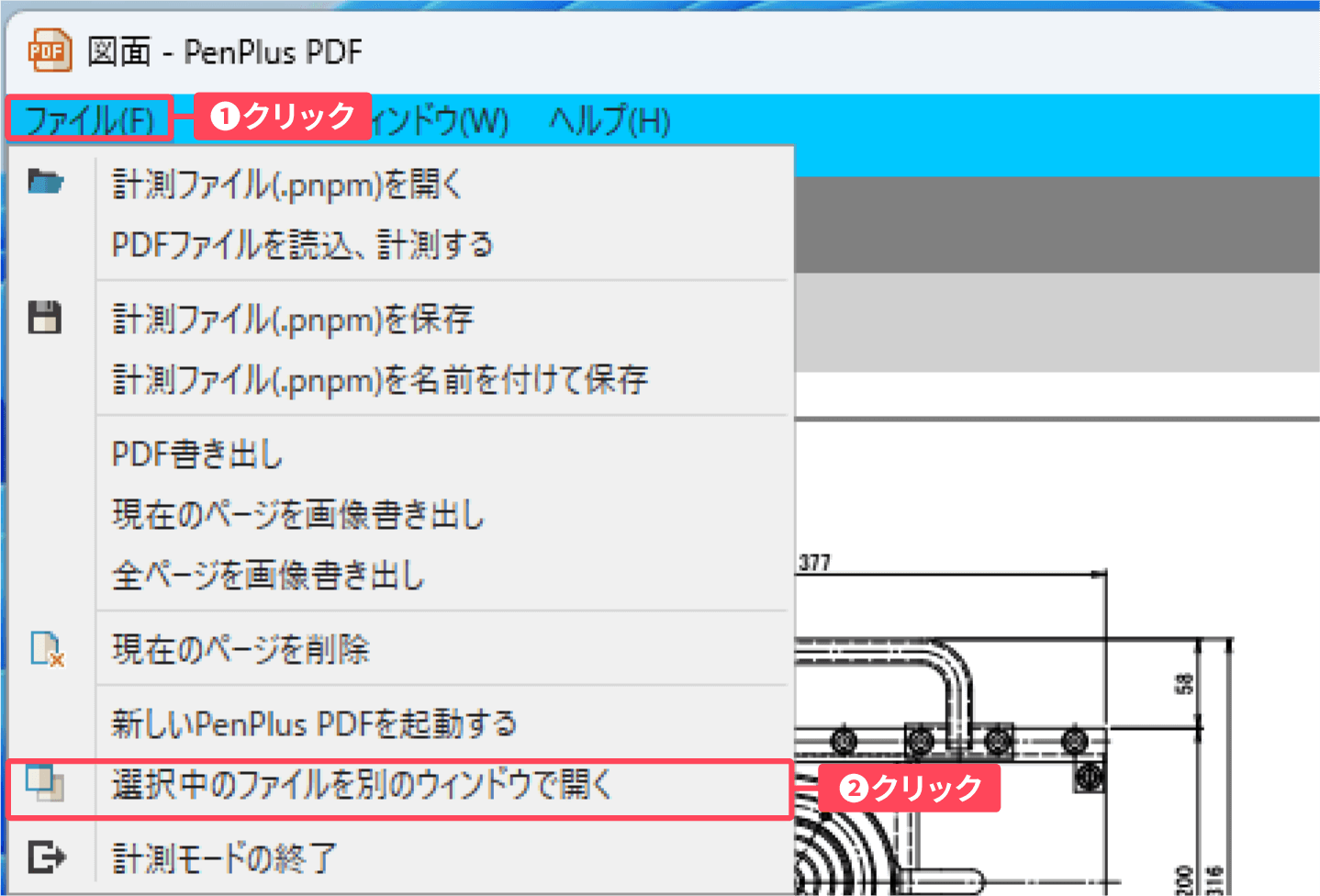 ①計測モード画面左上の「ファイル」 をクリックし、②表示されたメニューから「選択中のファイルを別のウインドウで開く」をクリックします。