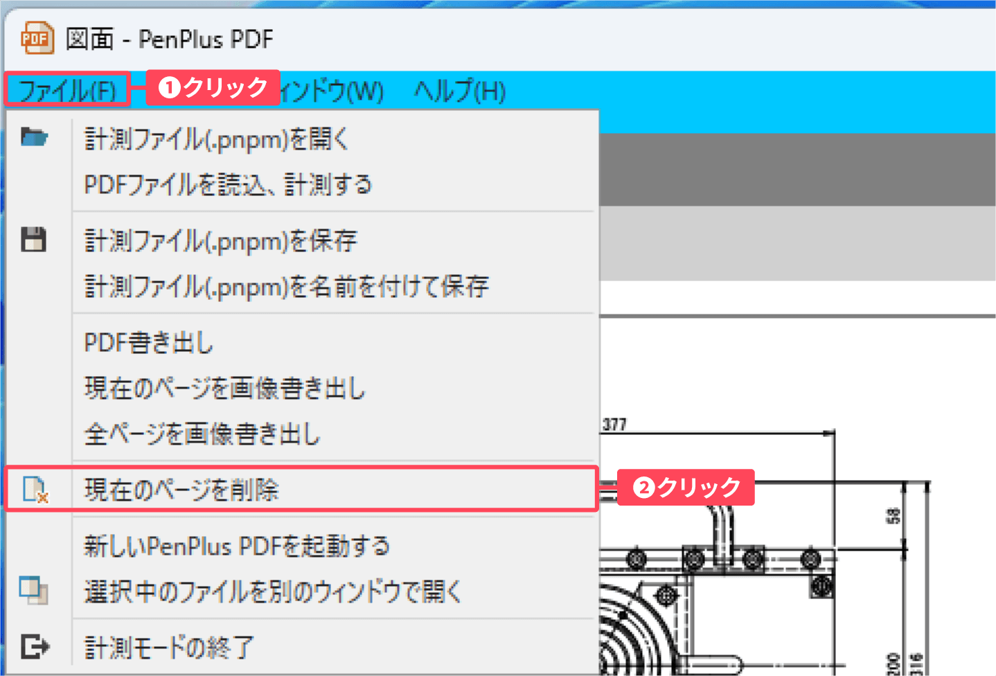 ①計測モード画面左上の「ファイル」 をクリックし、②表示されたメニューから「現在のページを削除」をクリックします。