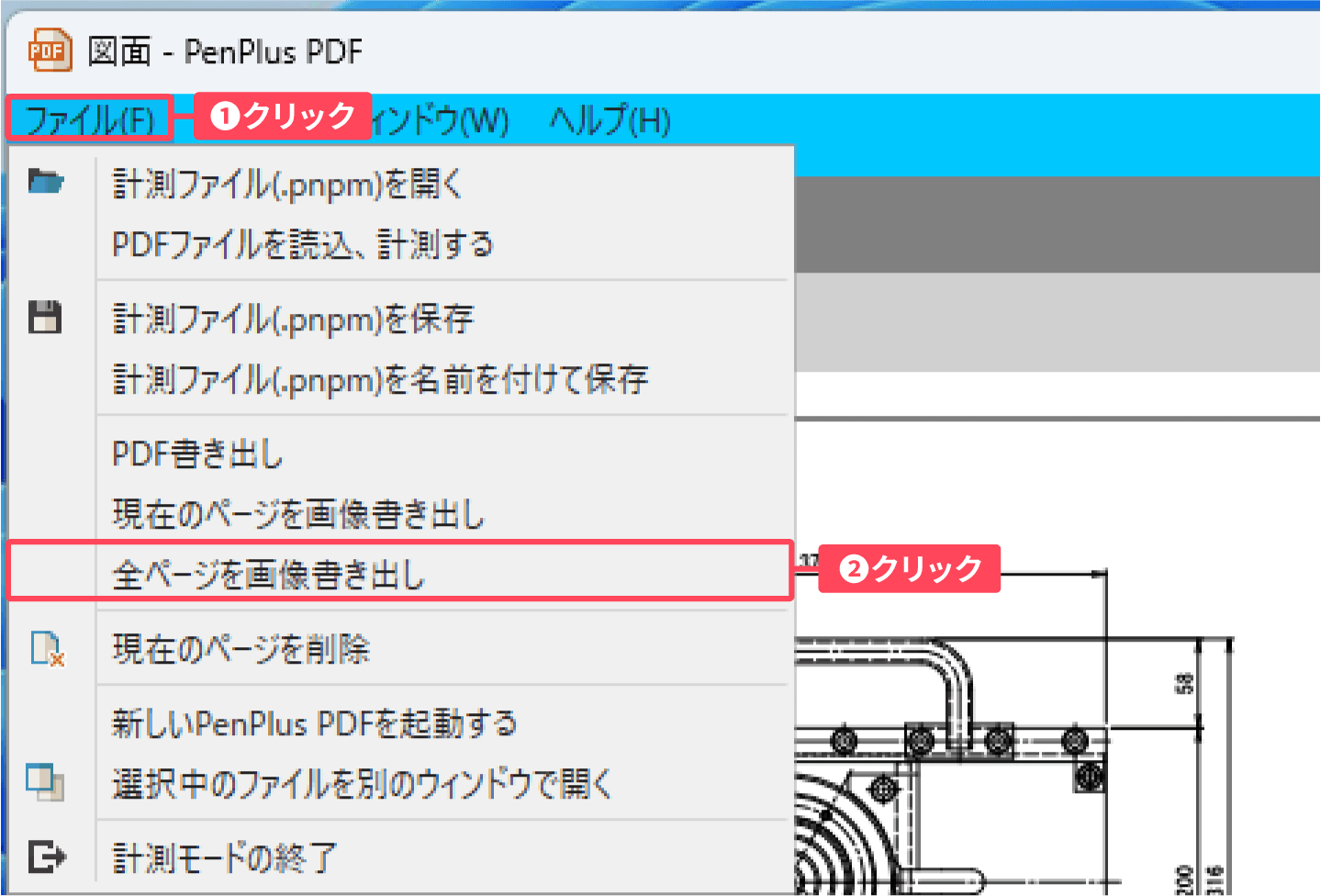 ①計測モード画面左上の「ファイル」 をクリックし、②表示されたメニューから「全ページを画像書き出し」をクリックします。
