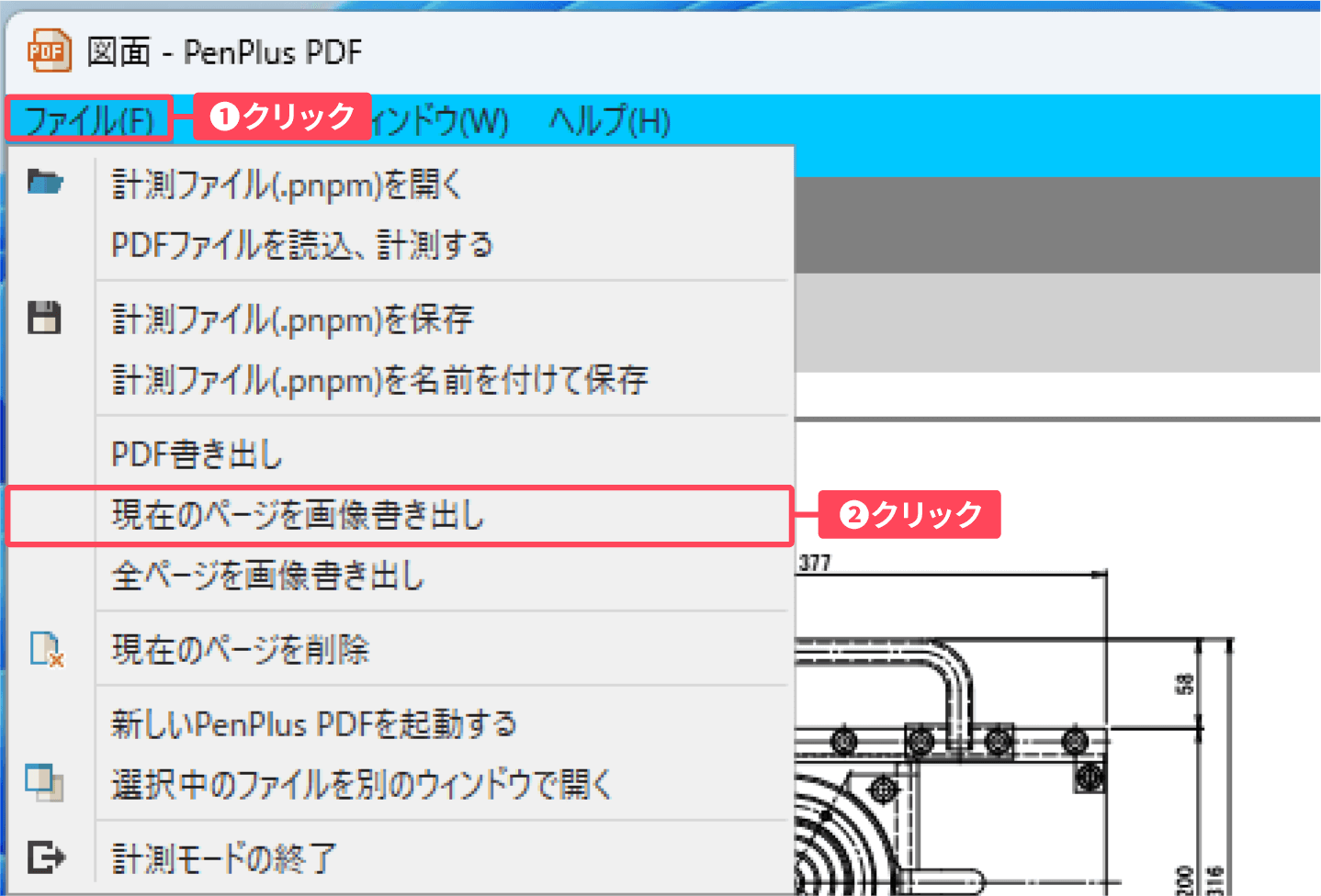 ①計測モード画面左上の「ファイル」 をクリックし、②表示されたメニューから「現在のページを画像書き出し」をクリックします。