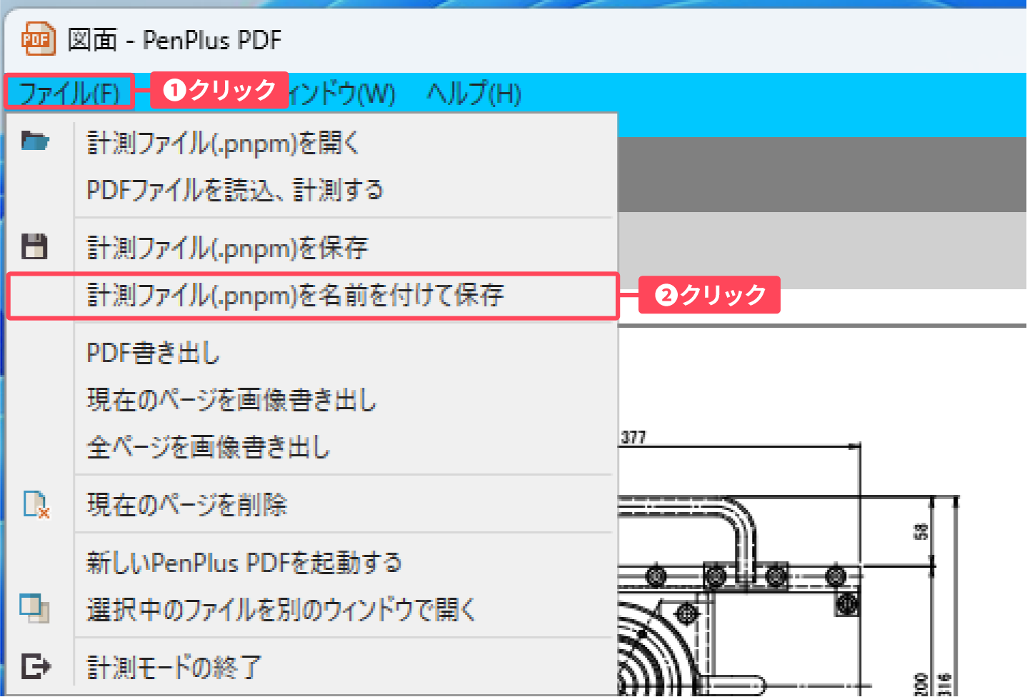 ①計測モード画面左上の「ファイル」 をクリックし、②表示されたメニューから「計測ファイル(.pnpm)を名前を付けて保存」をクリックします。