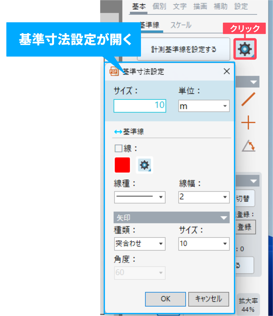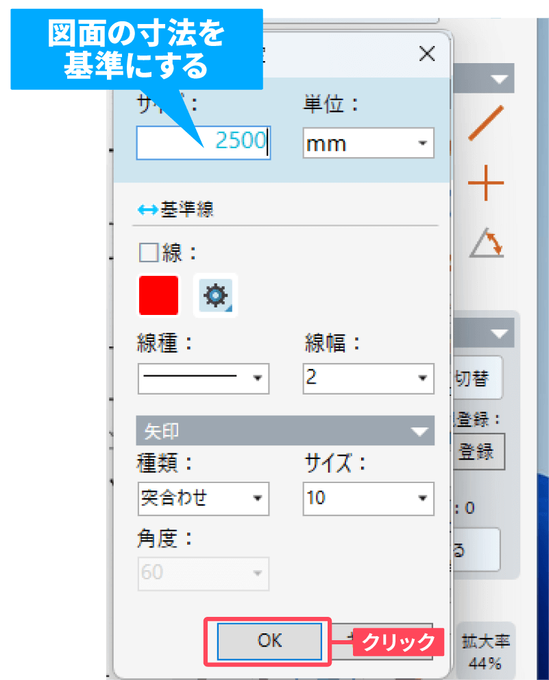 基準にしたい寸法と同じ長さで基準線を設定し、OKをクリックします。