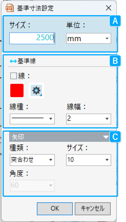 A | 基本寸法設定 | 基本線のサイズを指定します。 単位は【mm,cm,m,km,μm】から選択します。 |
