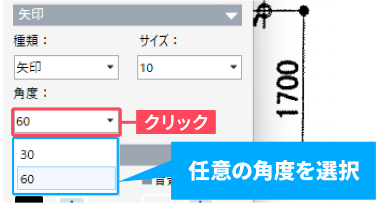 矢印・矢印(反転)の角度は30度・60度から選択できます。任意の種類を選択してください。