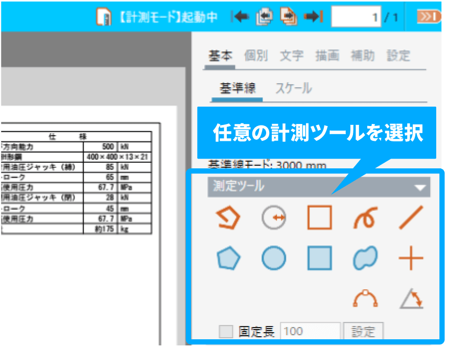 計測を始める前に、計測基本線を指定します。基準となる長さを設定することで計測ができるようになります。