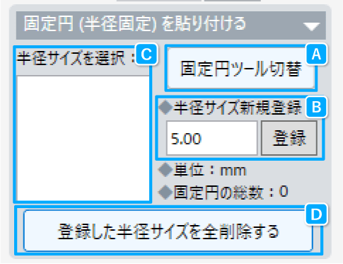 B | 半径サイズ新規登録 | 新たに指定したサイズで固定円の登録をします。 |