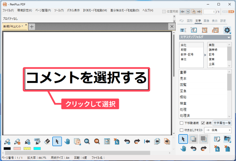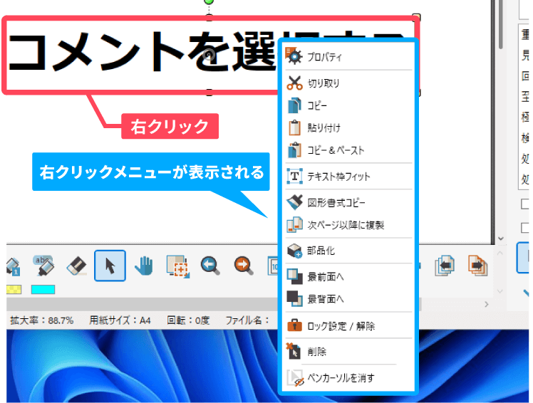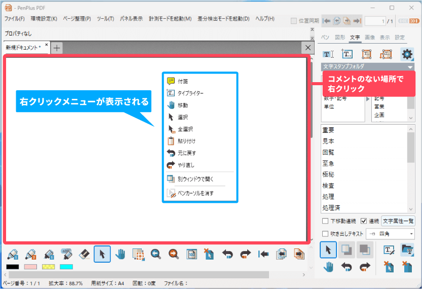 ドキュメント表示エリアのコメントがない場所で右クリックすると、右クリックメニューが表示されます。