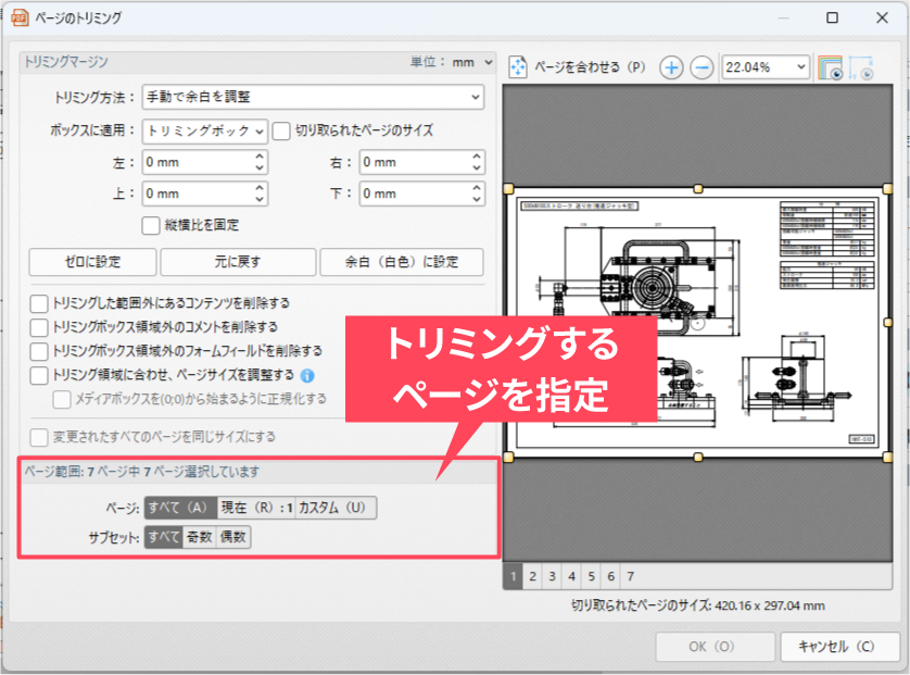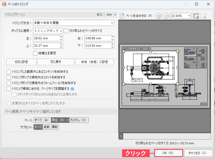 トリミング範囲や適用するページを確認し、問題がなければ 「OK」 をクリックします。