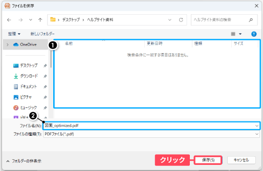 ② ファイル名(初期値は、ファイル名_optimized.pdfと表示されます)