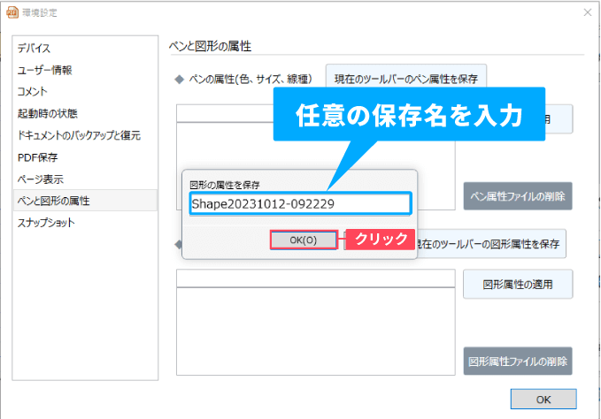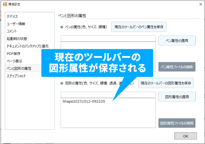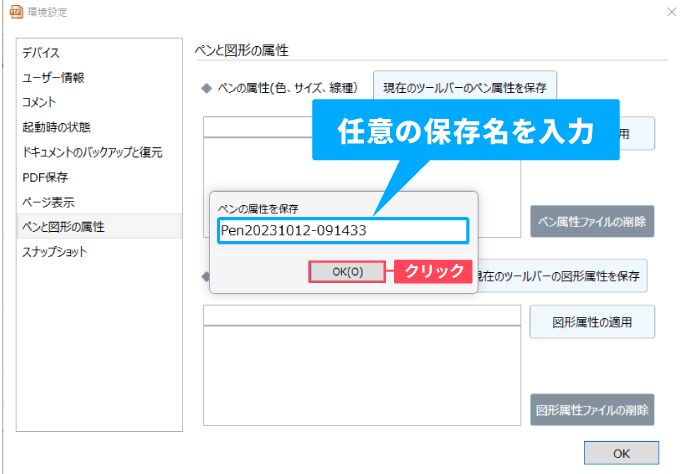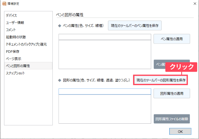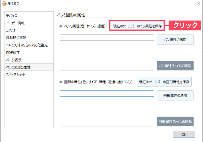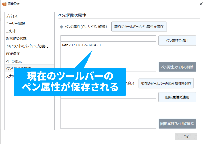 「現在のツールバーのペンの属性を保存」をクリックします。