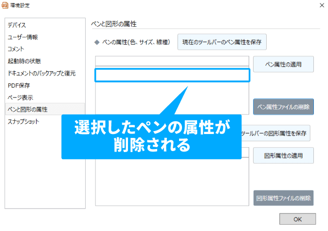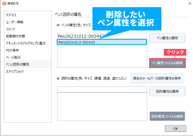 削除したいファイル名を選択し「ペン属性ファイルの削除」をクリックします。