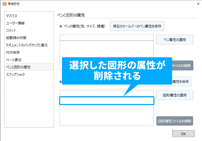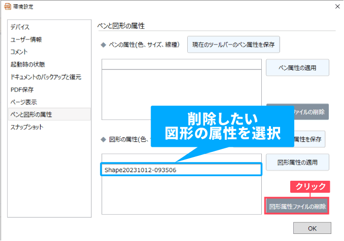 削除したいファイル名を選択し「図形属性ファイルの削除」をクリックします。