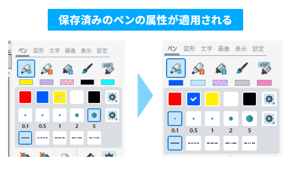 設定画面を閉じると、選択したペンの属性が適用されていることが確認できます。
