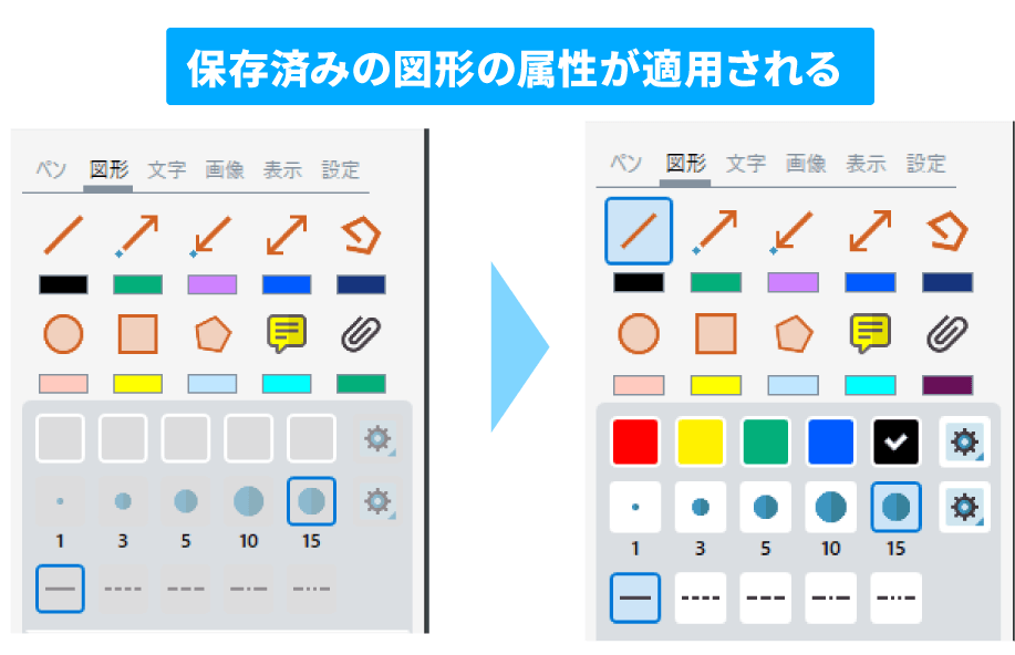 ペンと図形の色、線の太さを用途に合わせて保存し、変更できる様になりました。用途別にペン・図形の太さや色を予め保存しておくことで、効率よく作業が進められます。
