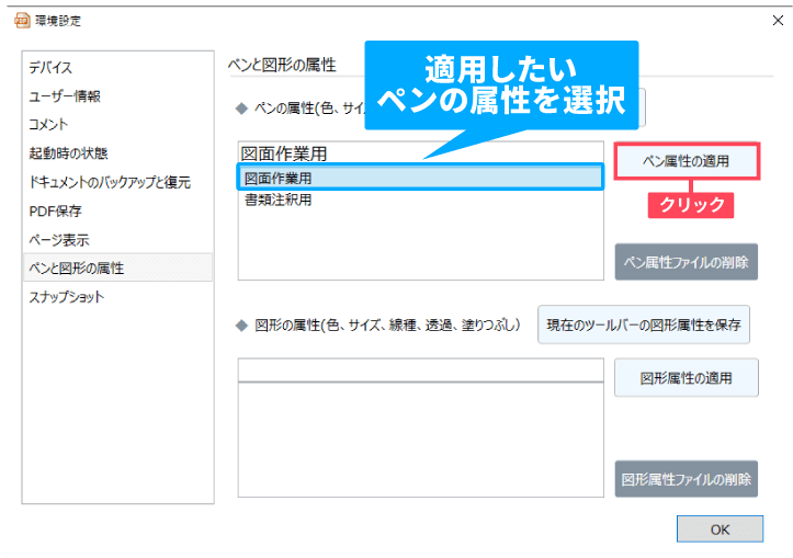適用したいペン属性ファイルを選択し「ペン属性の適用」をクリックします。