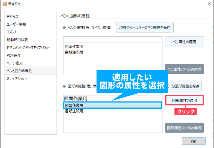 適用したいペン属性ファイルを選択し「図形属性の適用」をクリックします。