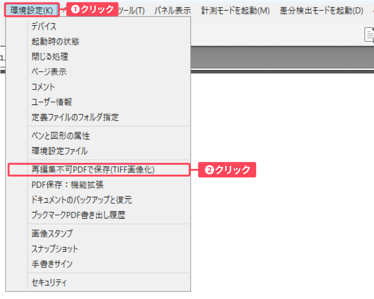 PDFモード画面左上の「環境設定」をクリックし、表示されたメニューから「再編集不可PDFで保存(TIFF画像化)」をクリックします。