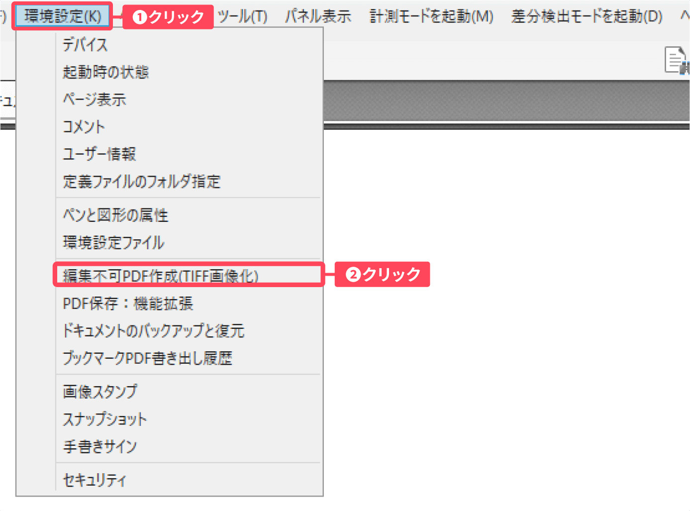 PDFモード画面左上の「環境設定」をクリックし、表示されたメニューから「編集不可PDF作成(TIFF画像化)」をクリックします。