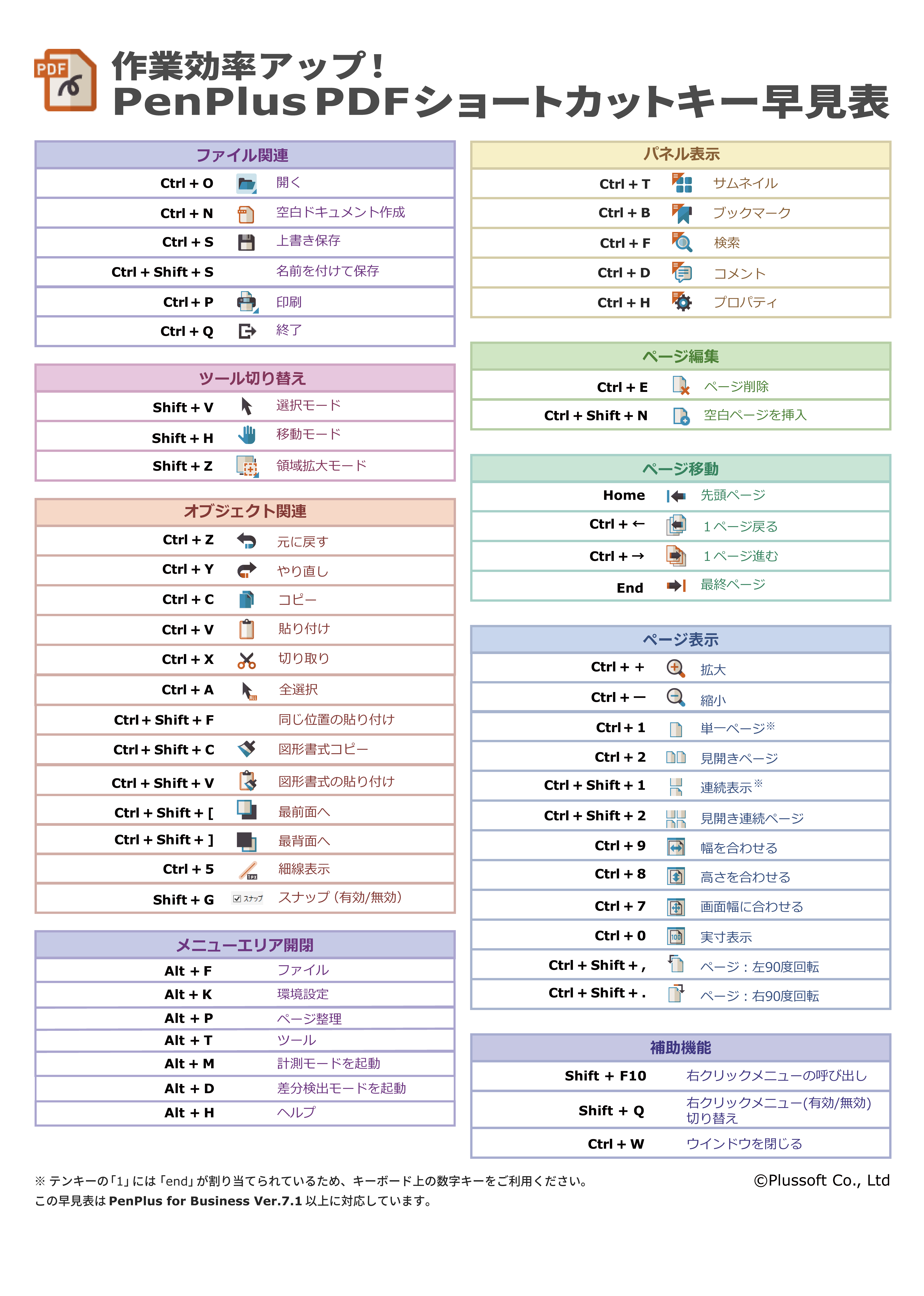 以下の表は、PenPlus for Business ver7.1対応版のショートカットキー一覧表です。印刷して作業にお役立てください。