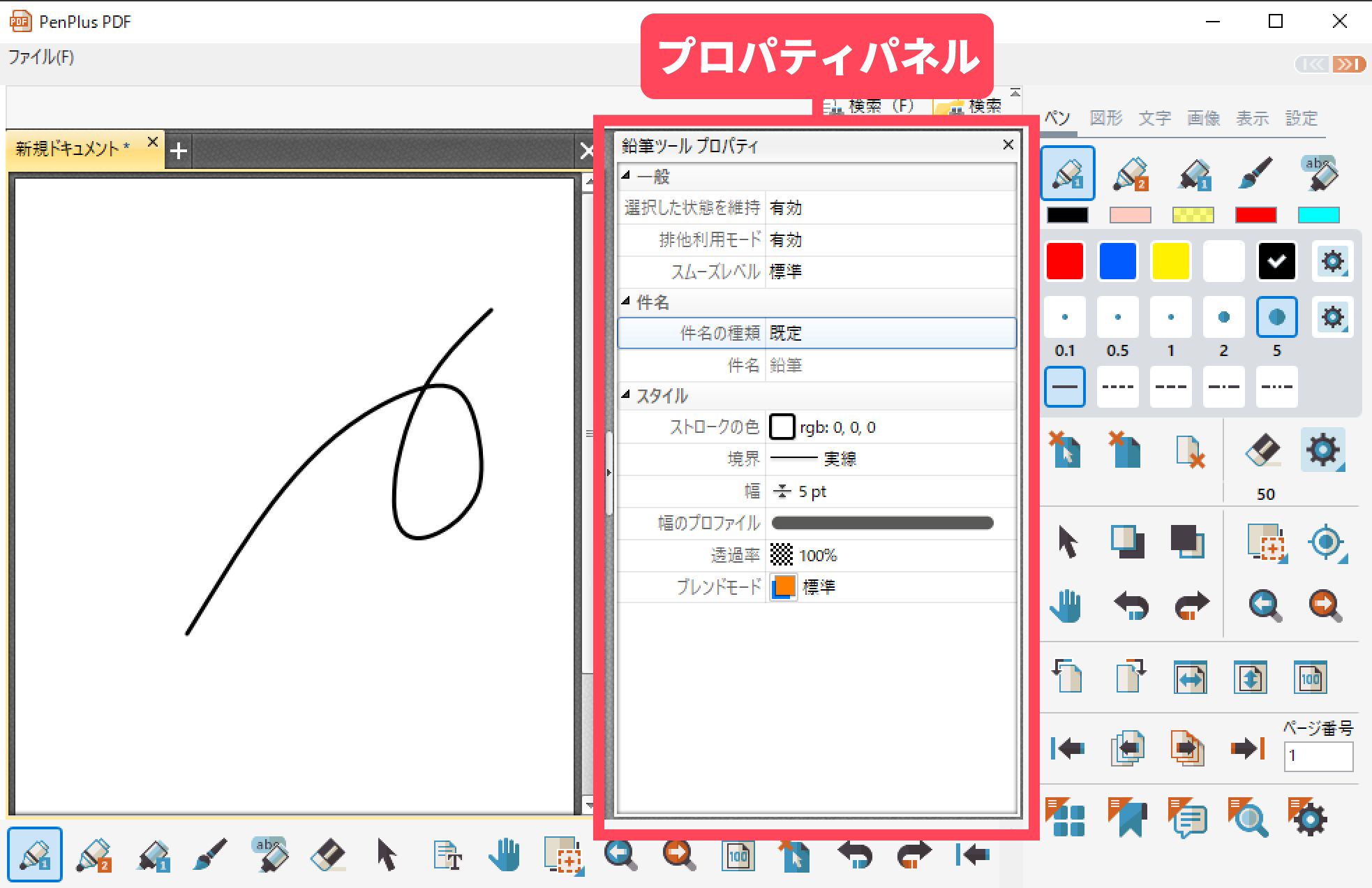 - ①[プロパティエリア]からペン描画の色や太さを変更します。